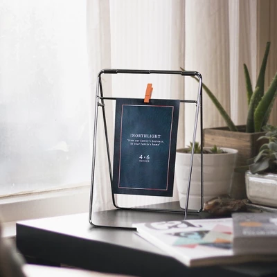 Clip your favorite photo onto this adorable photo frame. Add this frame to your desk or to a side table to add a personalized touch to any room in your home. Display your favorite photo so that you never forget the good times.Product Features:Features modern style clip on photo frameHolds one 4” x 6” photoPerfect to put on a desk or side table This frame can only be displayed verticallyRecommended for indoor use onlyDimensions: 9.75″H x 6.25″W x 3.5″D Material(s): metal
